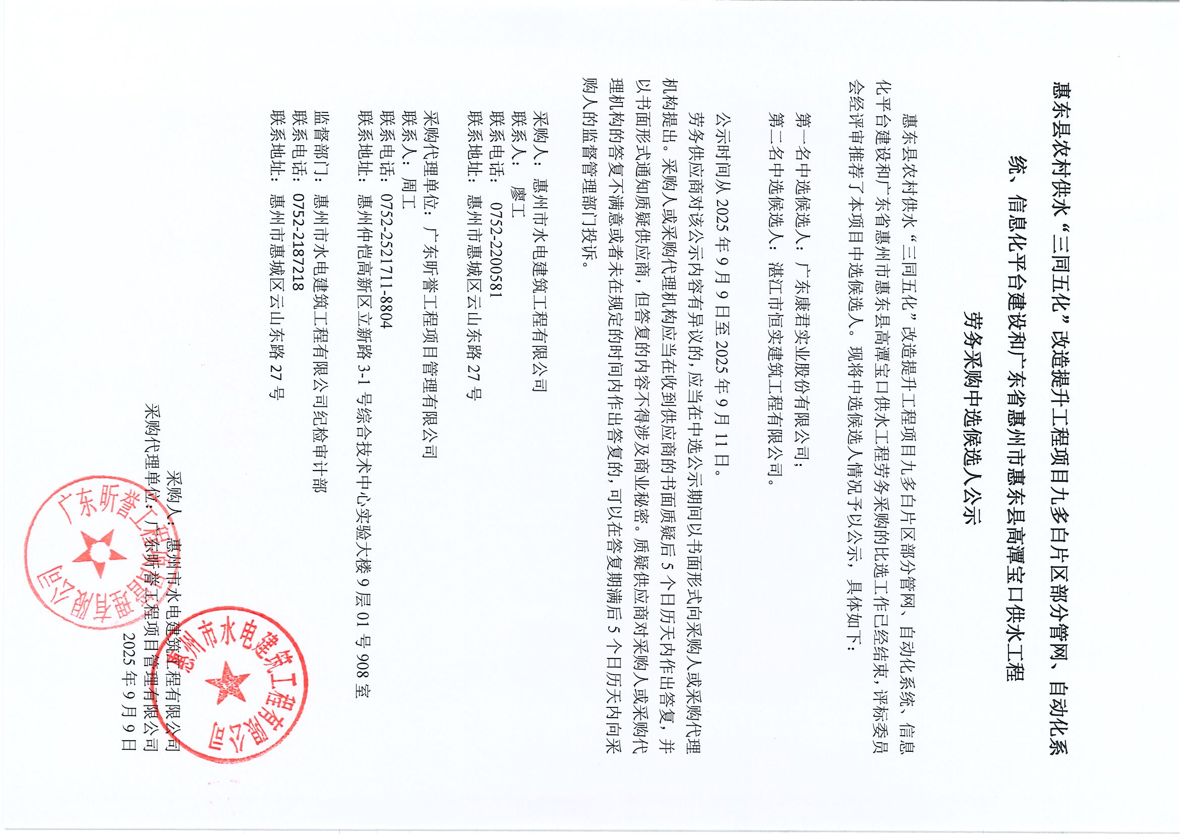 惠東縣農(nóng)村供水“三同五化”改造提升工程項(xiàng)目九多白片區(qū)部分管網(wǎng)、自動(dòng)化系統(tǒng)、信息化平臺(tái)建設(shè)和廣東省惠州市惠東縣高潭寶口供水工程勞務(wù)采購(gòu)中選候選人公示