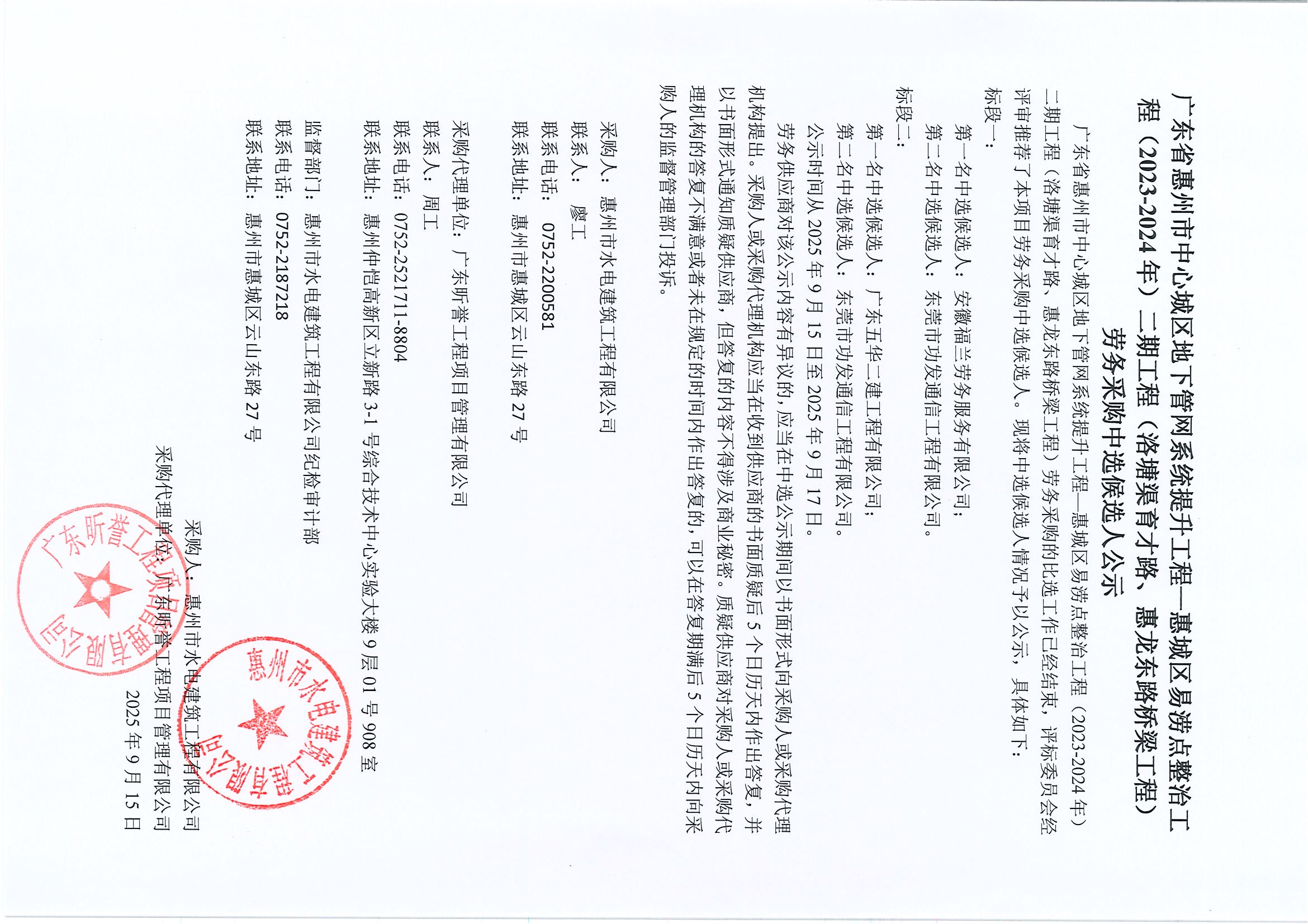 廣東省惠州市中心城區(qū)地下管網(wǎng)系統(tǒng)提升工程—惠城區(qū)易澇點(diǎn)整治工程(2023-2024年)二期工程(洛塘渠育才路、惠龍東路橋梁工程)勞務(wù)采購中選候選人公示