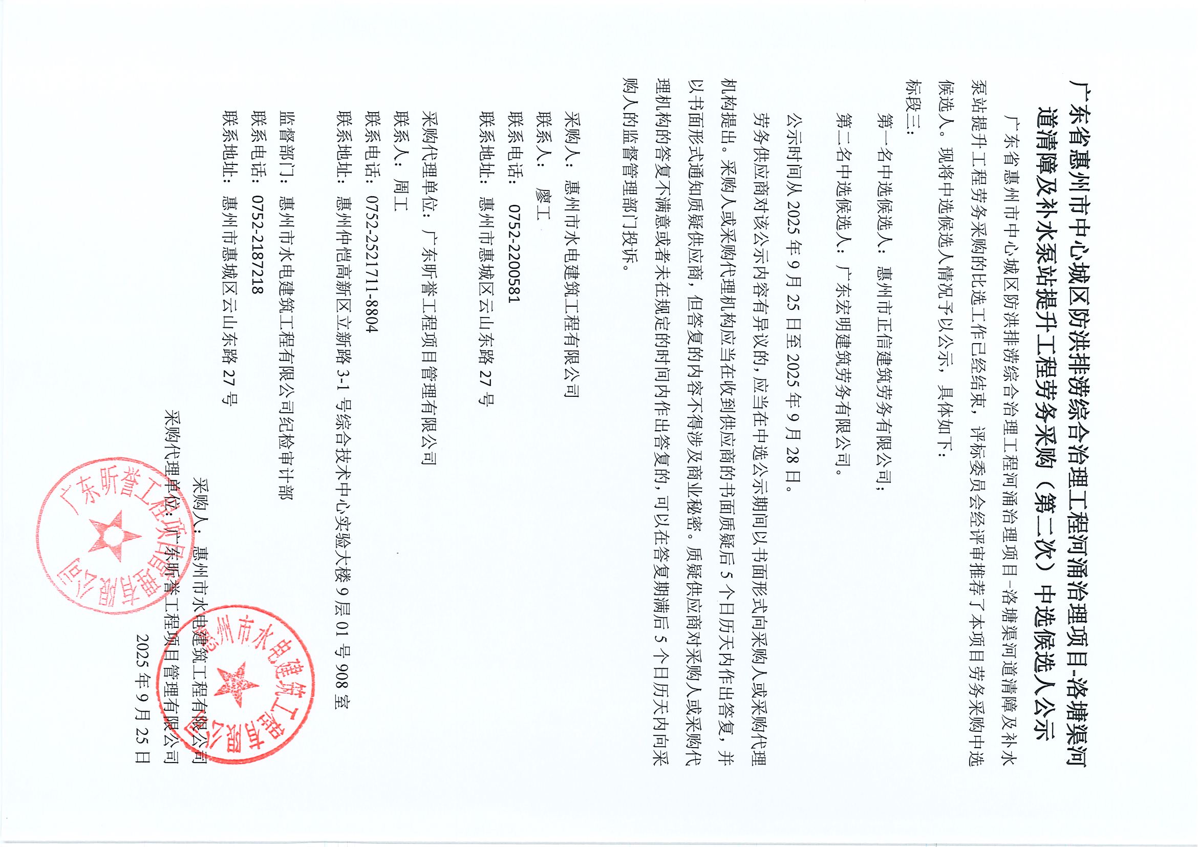 廣東省惠州市中心城區(qū)防洪排澇綜合治理工程河涌治理項目-洛塘渠河道清障及補水泵站提升工程勞務采購(第二次)中選候選人公示